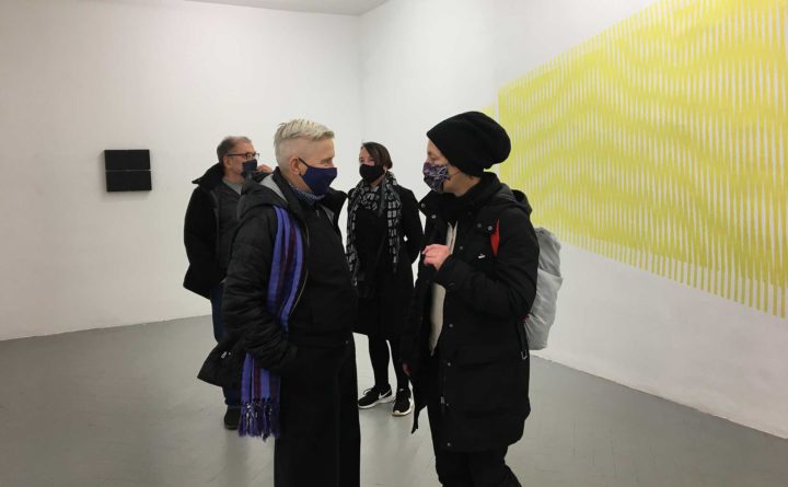 Sowohl die temporären Tapeinstallation als auch die in den Raum gestellten bemalten Objekte arbeiten mit komplexen visuellen Reizen. Die dadurch ausgelöste Irritation lässt die Betrachter:inn den primären „Gegenüber-Standpunkt“ verlassen und das Spiel mit dem Raum aufnehmen. Der Wechsel des Betrachtungs- standpunktes kann die Farbwahrnehmung verändern (Ton-in Ton Bemalung der Objekte) oder die Illusion von Bewegung hervorrufen (Moirè-effekt der Tape-Installation).